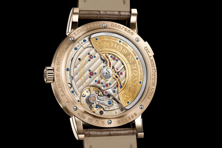 蜂蜜金的朗格少见,品牌CEO Wilhelm Schmid 先生告诉媒体的原因是“实在做不了那么多”,它得在无氧环境下加工,硬度远超黄金所以刀具损耗更快。这点我用数据说话,蜂蜜金的硬度略超过300Hv,而18K黄金只有150,950铂金为180。严苛的加工条件之后,得到了表现力独特的贵金属材质,蜂蜜金避免了贵金属的娇嫩,色泽也在粉红金和白金之间随着光线变换而慢慢流转,很难准确定义,真要说,它只能是专属的“蜂蜜金色”。