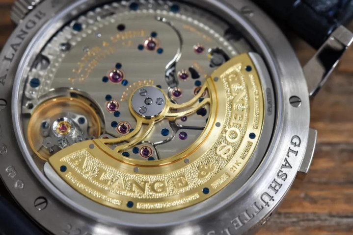 大家熟悉的德味、签名式的朗格元素,L021.1 上都有,特别是擒纵机构上的自研游丝、手工雕花摆轮夹板等等,但原本的3/4夹板被拆分成四块夹板,这点与众不同。因为拆分,所以有更多固定点,带来更多宝石轴承和蓝钢螺丝,黄金套筒在它们中间光彩熠熠。这块机芯的宝石比朗格1的 L121.1 机芯多了50%,这在一定程度上弥补了自动陀对机芯的遮挡,露出来的部份给你更紧凑的视觉享受。